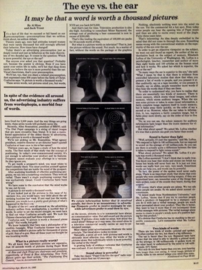 The March 14, 1983 issue of ADVERTISING AGE carried an article of huge significance to radio advertisers and the radio advertising professionals who serve them.  "The eye vs. the ear" by authors Al Ries and Jack Trout offered compelling evidence that the human mind works by ear more than by eye, and that consumers tend to prefer ear-oriented communication over eye-oriented communication.