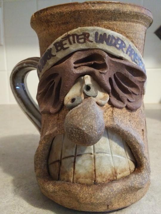 Here's my favorite coffee mug. Survived a lot of stations with me. Was made by a potter, wife of a morning show dude I used to work with at WAKR in Akron. Made only for me. Might be the only one in existence. So captures the rigors of a writing/production dude on "one of those days"